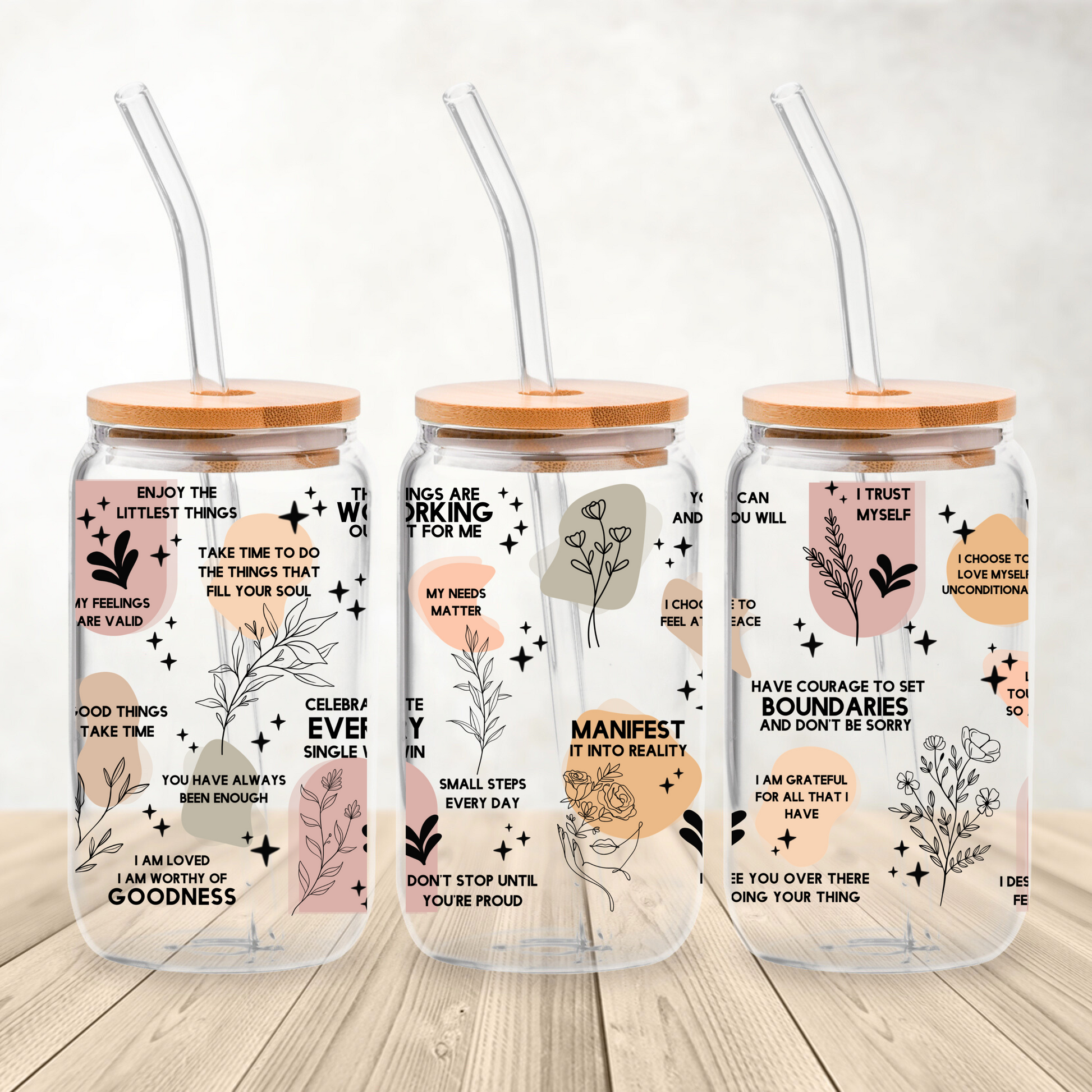Your Daily Dose of Positivity. Sip your affirmations daily with this 16 oz glass can tumbler featuring a full 360° wraparound design of motivational quotes and delicate floral aesthetic accents. Boost your mindset, one sip at a time.