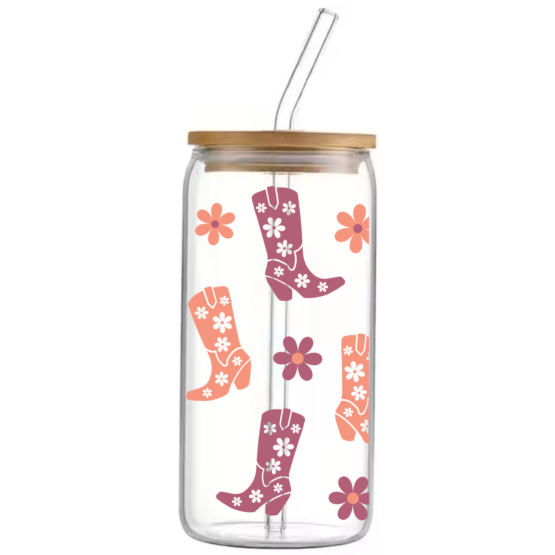 Channel your inner cowgirl with this 16 oz glass tumbler featuring a full 360° wraparound design of decked out in fun floral boots and western vibes. Yeehaw meets hydration!