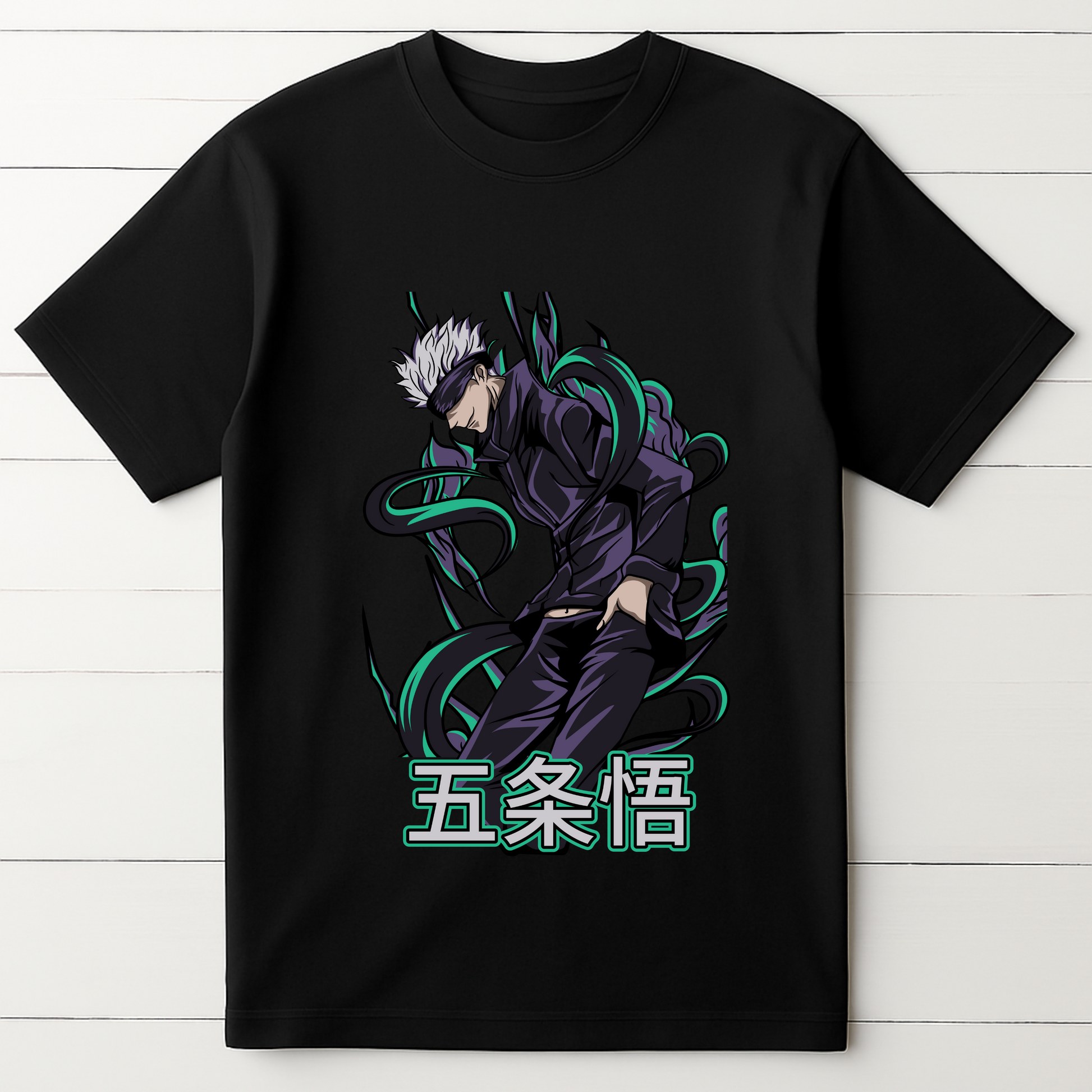 This Gojo Satoru T-Shirt, featuring the iconic sorcerer surrounded by cursed energy in a bold, modern design. Perfect for fans of Jujutsu Kaisen who appreciate power and style.