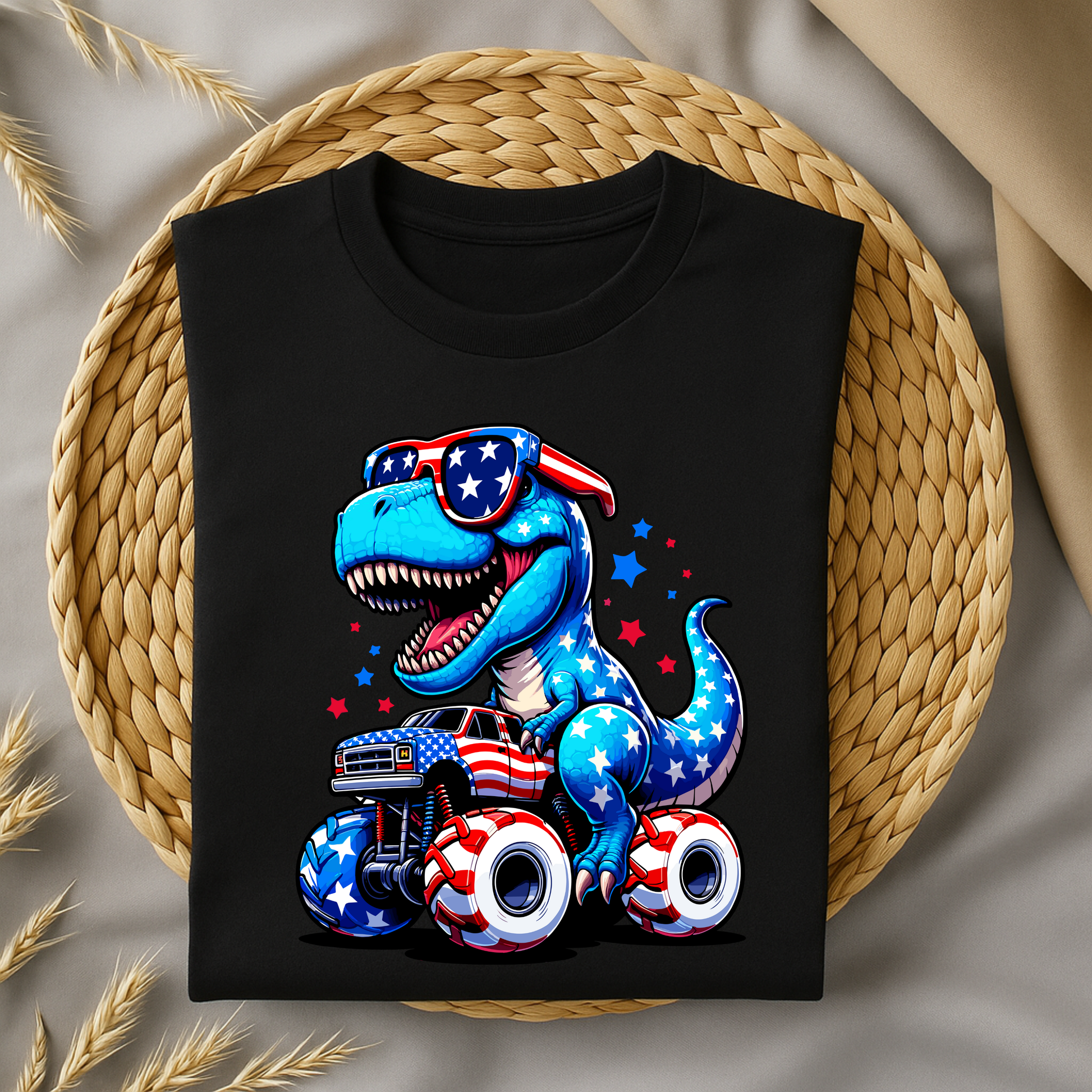 This red, white, and blue T-Rex monster truck mashup is the ultimate kid T-Shirt for patriotic fun!